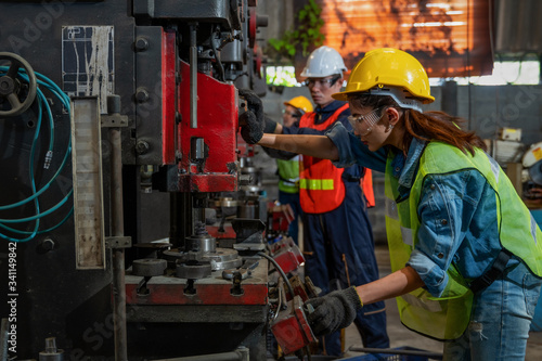 asian female and male manufacturing workers operating steel drilling machine together in line of metal work production factory