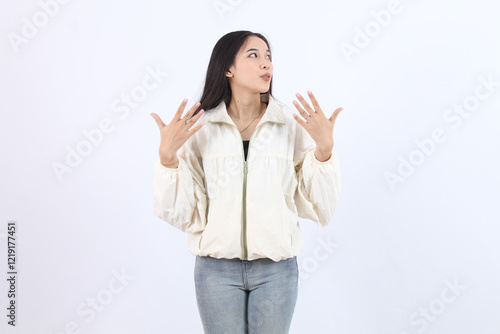 Asian girl feels hot waving her hands around her body to fan it to make it cooler