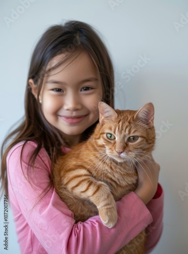 Asian girl hugging an orange cat