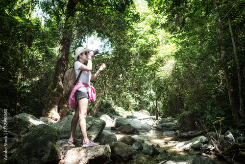 Asian hipster tourism women take a photo of waterfall in deep forest. Travel Concept.