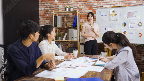 asian japanese business man and women people having discussion in modern office. Young female manager standing addressing colleagues at meeting in boardroom. four teamwork partners in workplace.