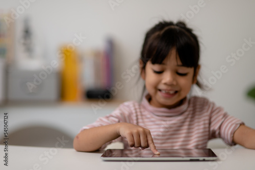 Asian little cute girl touching the digital tablet screen on the table