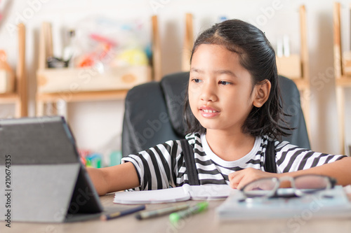 Asian little girl doing homework on wooden table select focus shallow depth of field