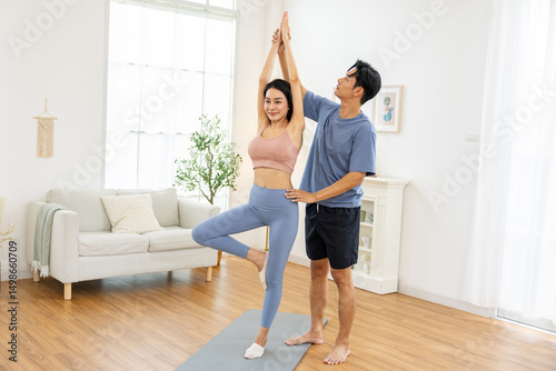 Asian man assists woman in performing yoga pose in bright living room, showcasing balance and mindfulness. room features wooden flooring, sofa, and natural light