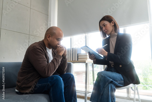 Asian man consulting with asian woman psychologist at mental health clinic. psychologist taking notes and talking with male patient with depression.