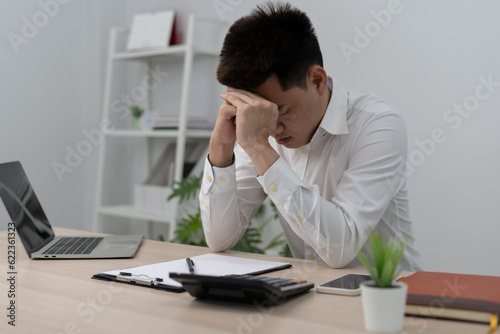 Asian man disappoint, sad after receive bad news. Stressed boy confused with unhappy problem, arguing with girlfriend, cry and worry about unexpected work, down economy.