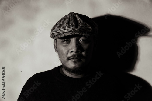 Asian man with mustache and beard and wearing scarf and newsboy hat poses close up. Detail of the face of an Asian man in his 30s wearing a newsboy hat and scarf in a monochrome photo