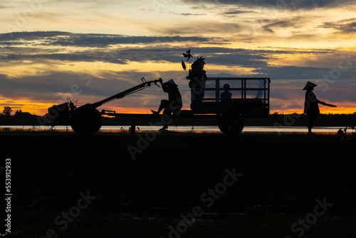 Asian Men and Women Gathering farmers produce rice export in rural communities. in the Morning, Light as a Silhouette
