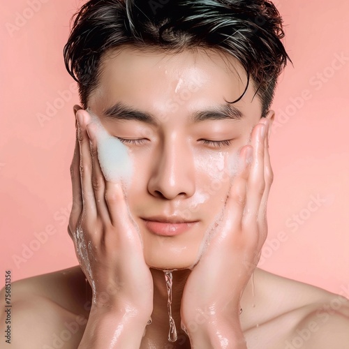 Asian men model washing his face with clean water. On a flat color background generative ai art