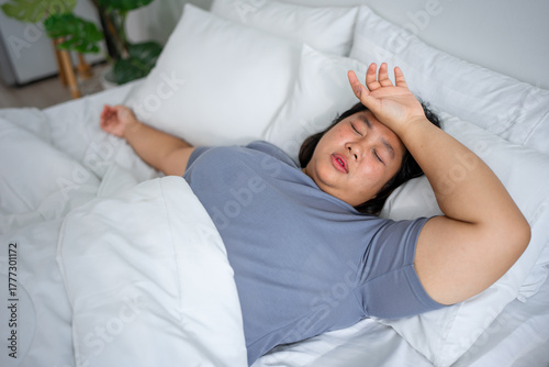 Asian plus-size woman sleep with headache and pain expression in house