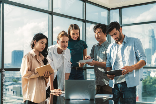 Asian project manager uses laptop displayed data analysis while professional business team brainstorming marketing idea at business meeting. Working together,sharing idea, planing strategy. Tracery.