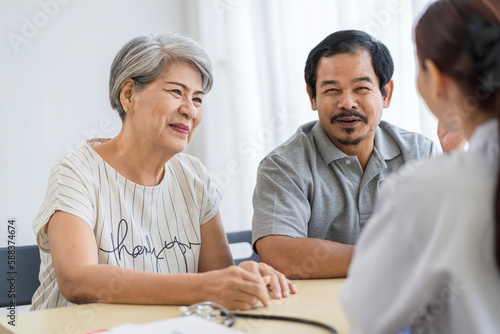 Asian seniors who are healthy, in a good mood, smiling, talking with financial or life insurance staff to take care of life after retirement.