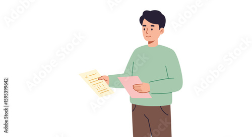 Asian teacher handing test papers in flat vector style