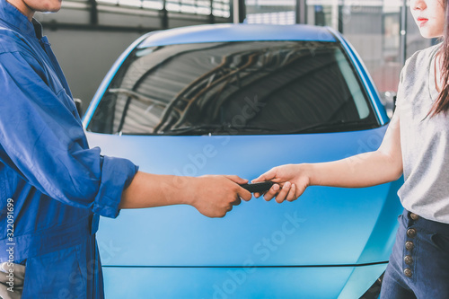 Asian woman customer smiling checking note clipboard with blue car in dealership service maintenance insurance and receives the keys from the mechanic Check the car before traveling.