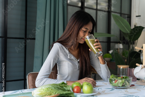 Asian woman drinking vegeteble juice with salad bow on table