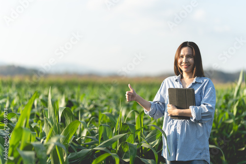 Asian woman farmer using laptop to store farm data In the evening with warm light. Agricultural technology concept. Organic agriculture.
