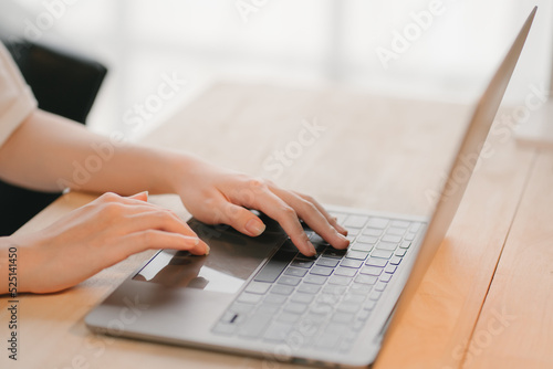 Asian woman happy holding laptop phone sitting sofa smiling good mood indoors indoors