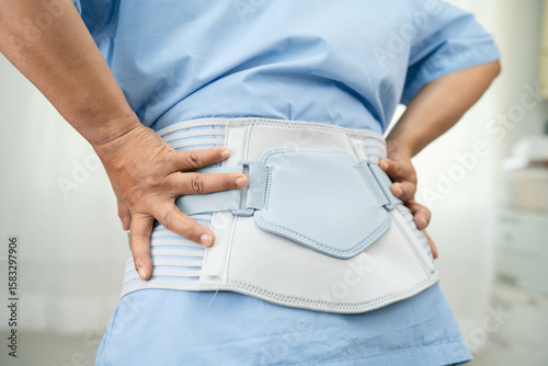 Asian woman patient wearing back pain support belt for orthopedic lumbar with walker.