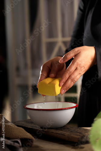 Asian Woman Preparing Raw Yellow Tofu