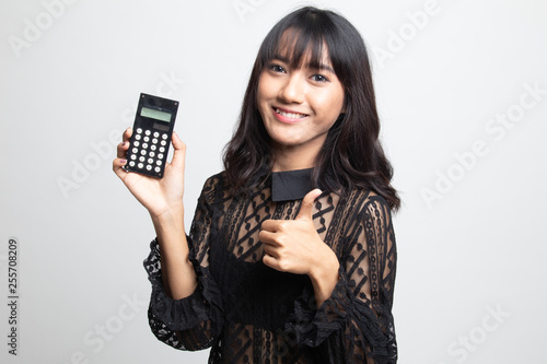 Asian woman thumbs up with calculator.