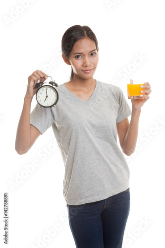 Asian woman with a clock drink orange juice.