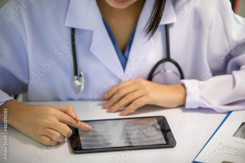 Asian women doctor working and analyzing x-ray images at hospital office