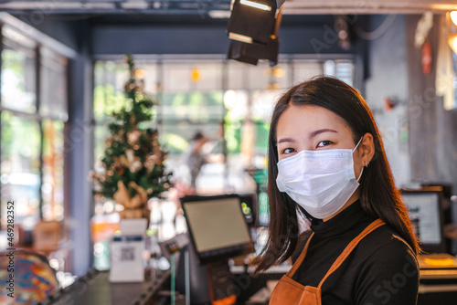 Asian young adult hipster gen z young woman is wearing protective face mask standing at the counter bar in coffee shop cafe. Open after lockdown quarantine. Social distance in everyday life concept