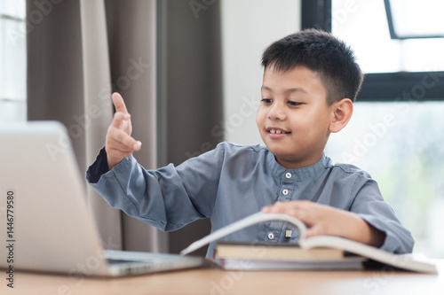 Asian young boy engages in online learning, smiling and interacting with laptop while studying at home. His enthusiasm for education is evident in this cozy setting