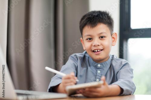 Asian young boy smiles while writing in notebook at desk with laptop. He appears engaged and happy, showcasing positive learning environment