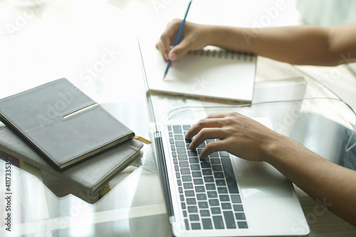 asian young student man entrepreneur working with computer writing note studying learning online at home. e-learning webinar meeting. social distance in covid pandemic