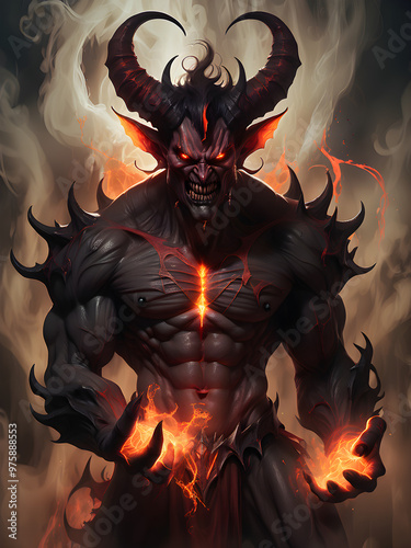 Asmodeus, Behemoth, Beelzebub, Lucifer, Salanus, Asmodeus, Belial, who look like demons with horns and a fiery black-orange aura swirling around their bodies, giving off an aura of vengeance and darkn