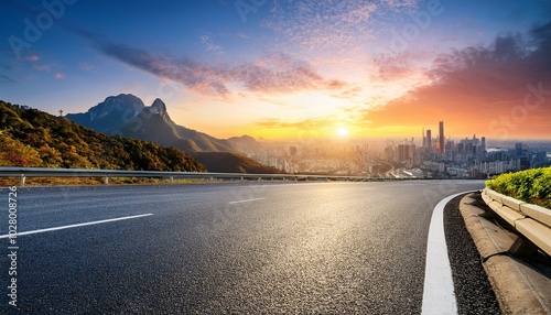 asphalt highway road and mountain with city skyline at sunset