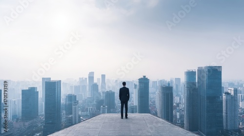 Aspirational Businessman Standing on Rooftop Overlooking Cityscape, Symbolizing Vision, Ambition, and Future Success