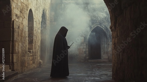 Assassination attempt in a remote monastery courtyard. Featuring a hooded figure wielding a dagger