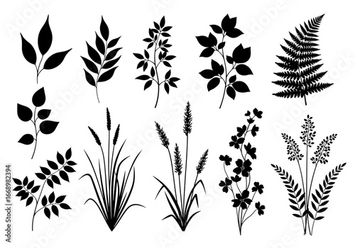 Assorted botanical silhouettes featuring leaves, ferns, grasses, and flowering plants arranged together