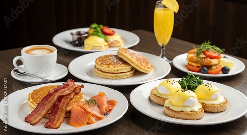 Assorted Brunch Food on Table with Pancakes and Eggs Benedict