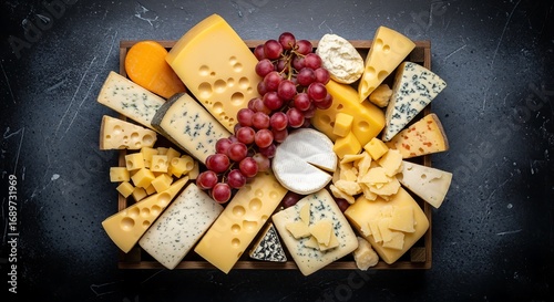 Assorted cheese varieties and grapes arranged on a wooden tray, ready to serve.