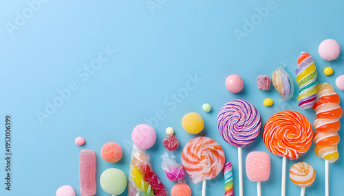 Assorted colorful candies and lollipops positioned on blue background flat lay style with copy space