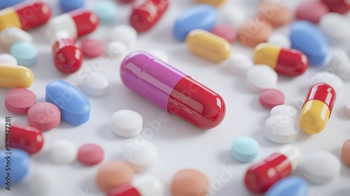 Assorted colorful pills and capsules scattered with currency on a white background highlighting the pharmaceutical and financial connection
