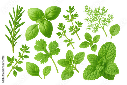 Assorted culinary herbs isolated on transparent background, cut out arrangement