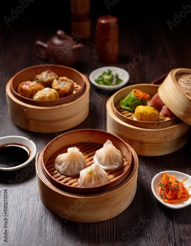 Assorted Dumplings Filled with Pork, Shrimp, and Vegetables, Captured in a Cozy Dim Sum Setting with Bamboo Steamers and Traditional Dipping Sauces