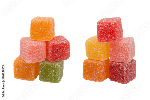 Assorted fruit jelly gummy cubes stacked on white background with sugar coating and vibrant natural colors