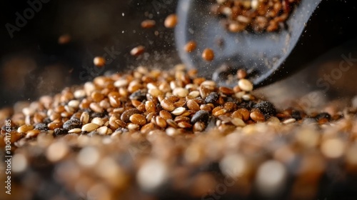 Assorted grains and seeds falling from scoop against dark background