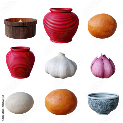 Assorted Kitchenware and Fresh Ingredients with Unique Shapes and Colors for Culinary Presentation, isolated on transparent background.