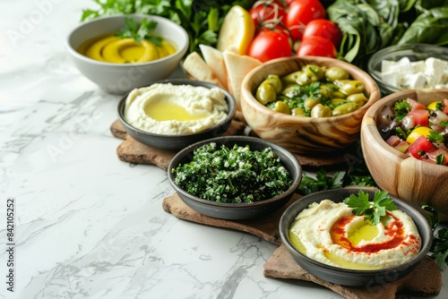 Assorted Mediterranean Dishes on Marble Table, Healthy and Fresh Food Concept