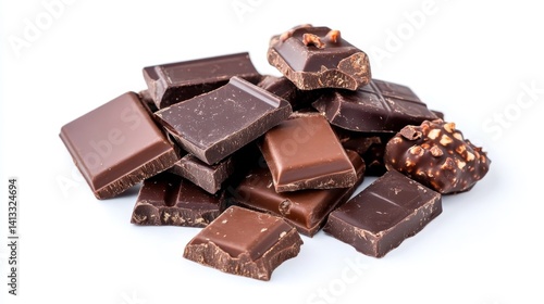 Assorted milk, dark and white chocolate pieces stacked on white background.