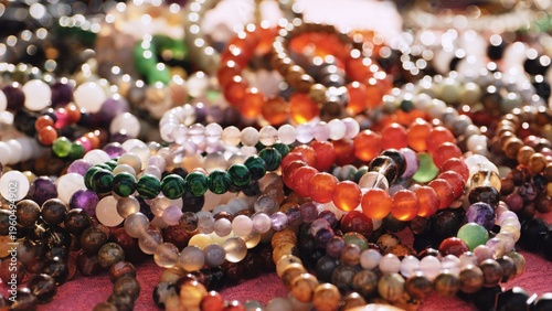 Assorted natural stone bead bracelets displayed, showing vibrant colors and textures