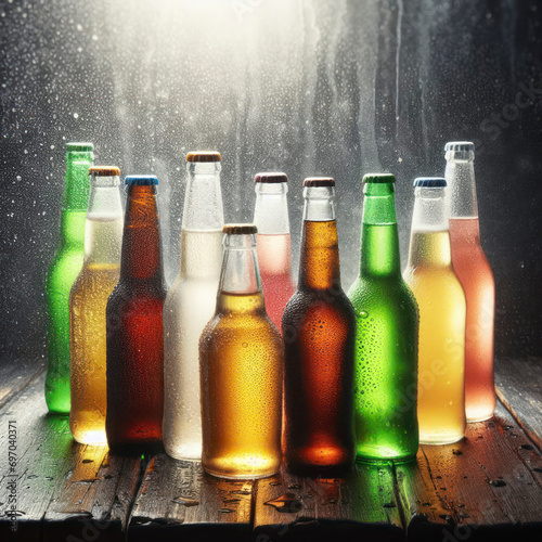 Assorted non alcoholic soda bottles with water droplets With copy space for text. ai generative