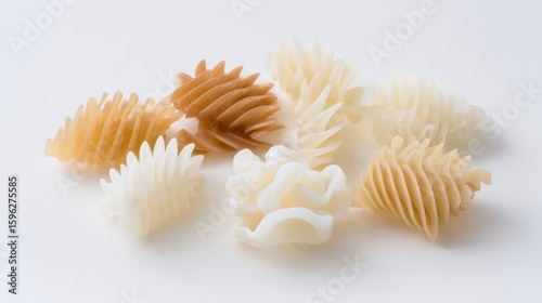 Assorted pasta shapes arranged artistically on a white background showcasing texture and color