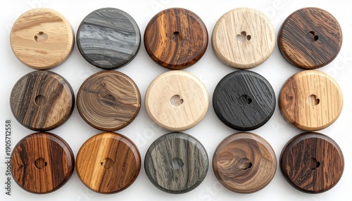 Assorted round wooden buttons with diverse natural grain patterns and colors.